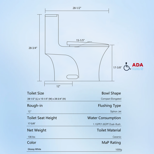 1.1/1.6 GPF Elongated Comfort Height Super Quite Flushing Floor Mounted One-Piece Toilet ,CUPC Certified, WaterSense Cetified, Ceramic, White Color, Soft Close Seat
