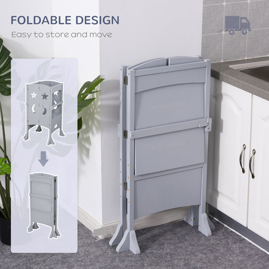 Qaba Wooden Kitchen Step Stool for Kids, Foldable Toddler Tower, Helper Stool for Kitchen Counter with Support Handles Safety Rail, Gray