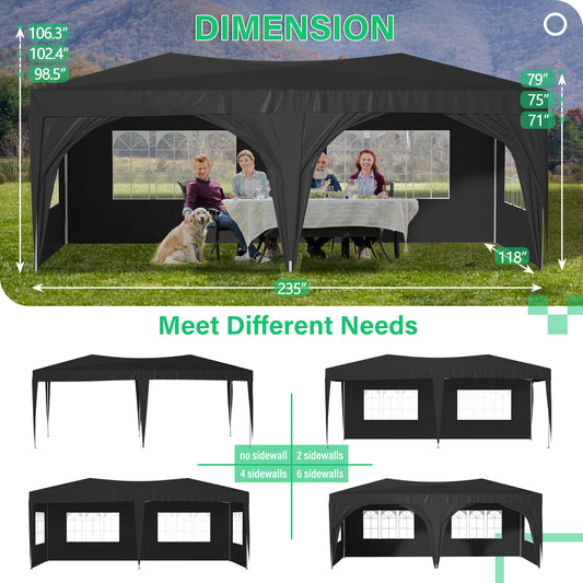 10'x20' Pop Up Canopy Tent with 6 Sidewalls, Ez Pop Up Outdoor Canopy for Parties, Waterproof Commercial Tent with 3 Adjustable Heights, Carry Bag, 6 Sand Bags, 6 Ropes and 12 Stakes, Black