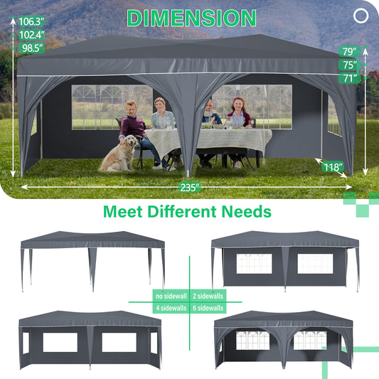 10'x20' Pop Up Canopy Tent with 6 Sidewalls, Ez Pop Up Outdoor Canopy for Parties, Waterproof Commercial Tent with 3 Adjustable Heights, Carry Bag, 6 Sand Bags, 6 Ropes and 12 Stakes, Gray