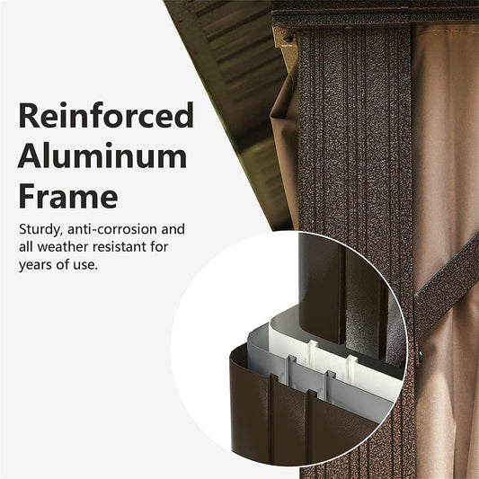 10'x12' Permanent Outdoor Galvanized Steel Roof Gazebo with Aluminum Frame, Pavilion Metal Gazebos with Netting & Curtains for Garden, Patios, Lawns, Parties(Dark Brown)