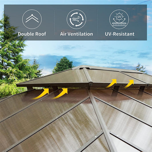 12x16ft Hardtop Gazebo, Permanent Outdoor Gazebo with Polycarbonate Double Roof, Aluminum Gazebo Pavilion with Curtain and Net for Garden, Patio, Lawns, Deck, Backyard(Brown)