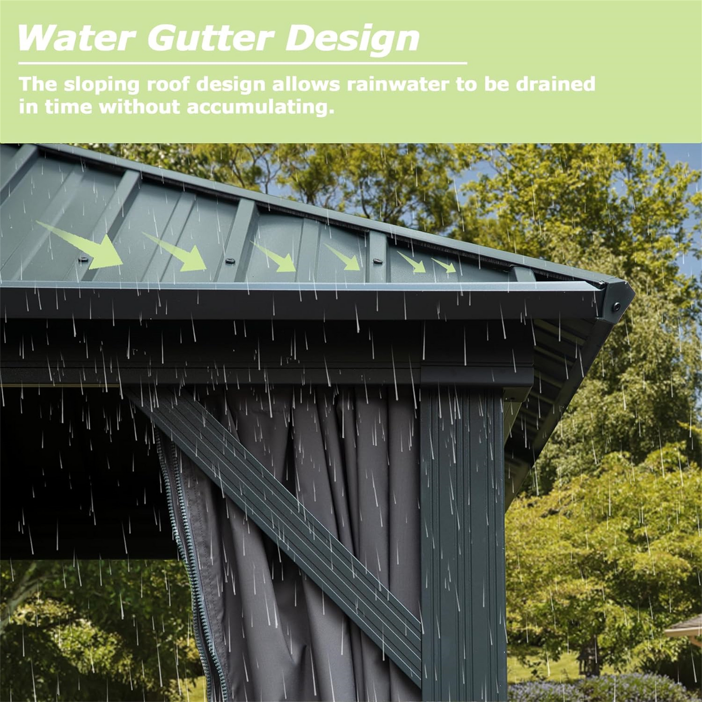 - Double Roof Design- The space between the two roof layers allows air to circulate, creating a ventilation system that helps keep the gazebo cool and comfortable even on hot summer days. Plus, the slope of the roof helps rain and snow to flow down and off the structure, reducing the risk of damage and ensuring a long-lasting, durable roof.