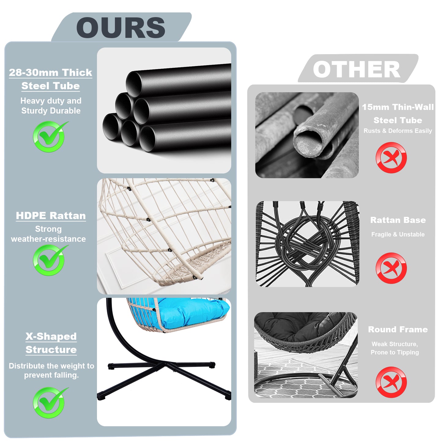- Consisting of an aluminum-steel frame and a sturdy heavy-duty steel stand, it ensures that the egg chairs will not rust and extend their life, and the sturdy stand provides stable support and is stable enough on any ground.
