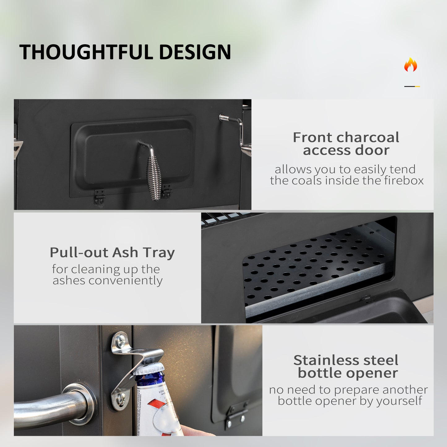 look to our grill's storage rack, side table, and tool hooks, and the answer appears. - Thoughtful Design: Our charcoal BBQ grill is easy to clean and safe to the touch with a pull-out ashtray and an anti-scald handle. It even includes a bottle opener, so you won't be left looking for a way to pop open a brewski.